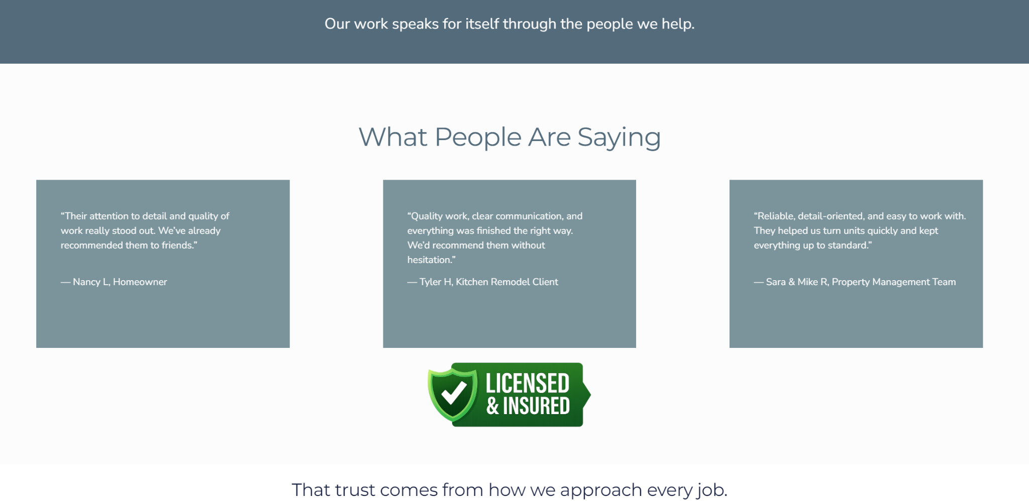 Licensed and insured messaging, testimonials, and clean visuals establish credibility immediately.